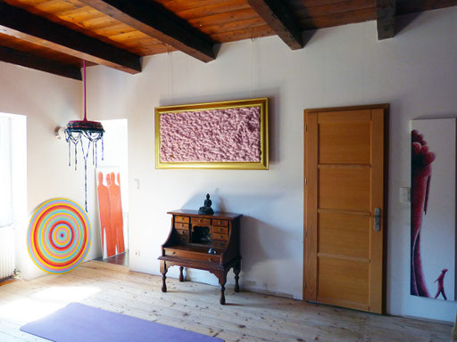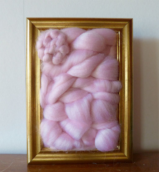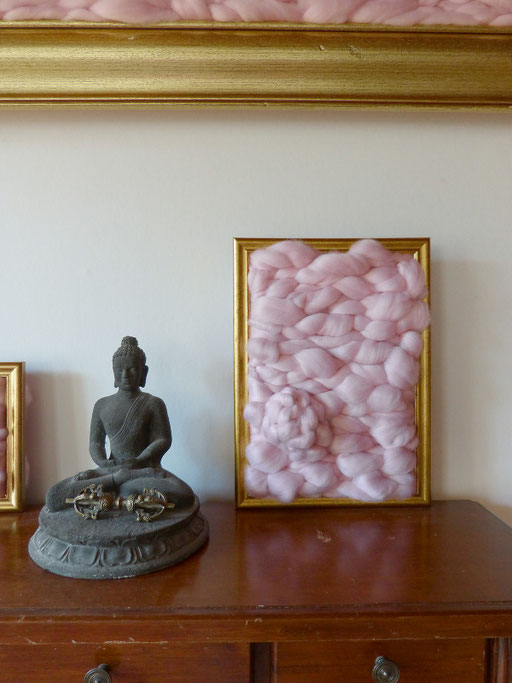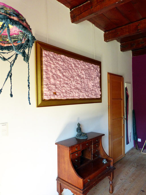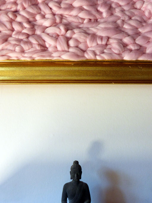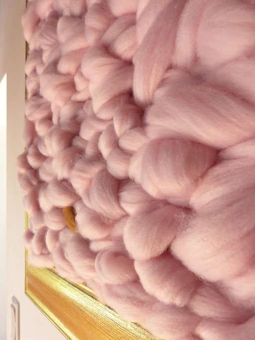 Pink Magnet est un mix entre un tableau textile, un tissage et une sculpture. Fait de nylon rose, tissé dans un cadre doré, il est doux à la vue et au toucher.